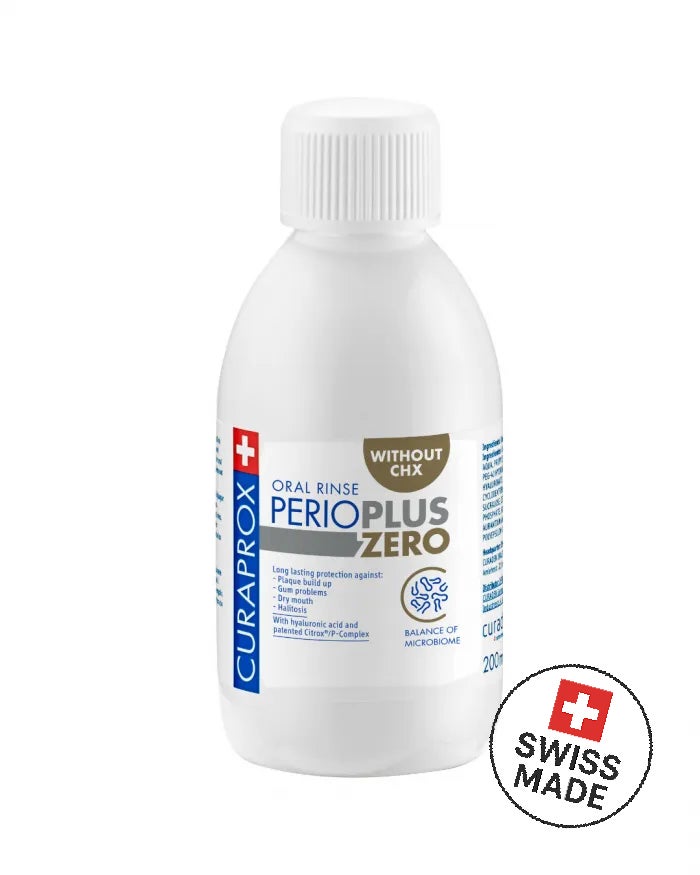 Curaprox Perio Plus Zero on uuden sukupolven suuvesi, joka tarjoaa tehokasta mutta hellävaraista suojaa suun terveydelle – ilman klooriheksidiiniä (CHX), alkoholia tai SLS:ää. Se on suunniteltu ehkäisemään haitallisten bakteerien leviämistä ja plakin muodostumista samalla, kun se säilyttää suun mikrobiomin tasapainon.