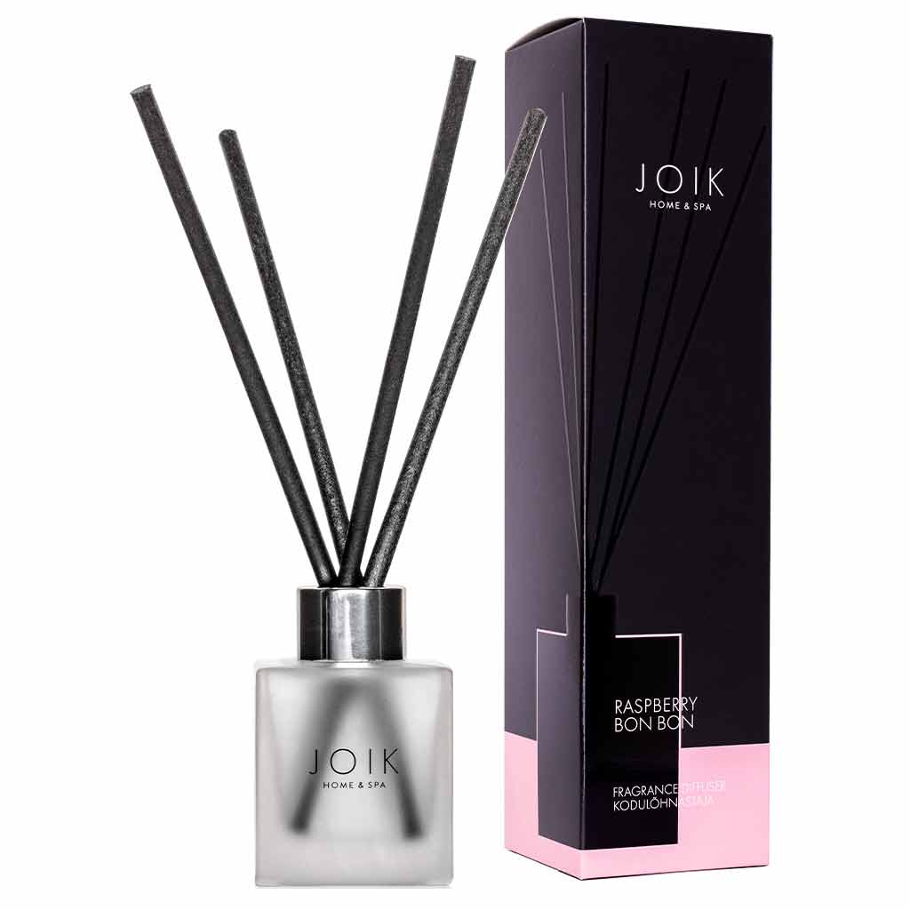 JOIK Raspberry BonBon -huonetuoksu vie sinut makeaan ja eksoottiseen maailmaan. Karamellin, vaniljan, tonkan ja valkoisen myskin pehmeät sävyt yhdistyvät vadelmaan, kukkiin ja kermaiseen kookokseen. Manteli ja calisson viimeistelevät tämän huumaavan kokonaisuuden, joka herättää tilan eloon ja tuo siihen lämpöä ja leikkisyyttä. JOIKin Home & SPA -sarjan huonetuoksut ovat täydellinen vaihtoehto, kun kynttilöiden käyttö ei ole mahdollista – kasvipohjaiset öljyt ja laadukkaat synteettiset tuoksut takaavat pitkän ja tasaisen tuoksukokemuksen.